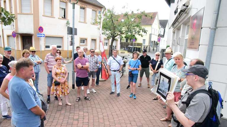 Die Strecke führte vom Marktplatz über Kurt-Schumacher-, Kapellen- und Steinheimer Straße bis zum Friedhof Schwarzbachstraße. Die beiden Stadtführer wussten fast vor jedem zweiten Haus ein Stück Geschichte aus dem einstigen Dorf zu erzählen und mit vergrößerten und laminierten Fotos zu belegen.