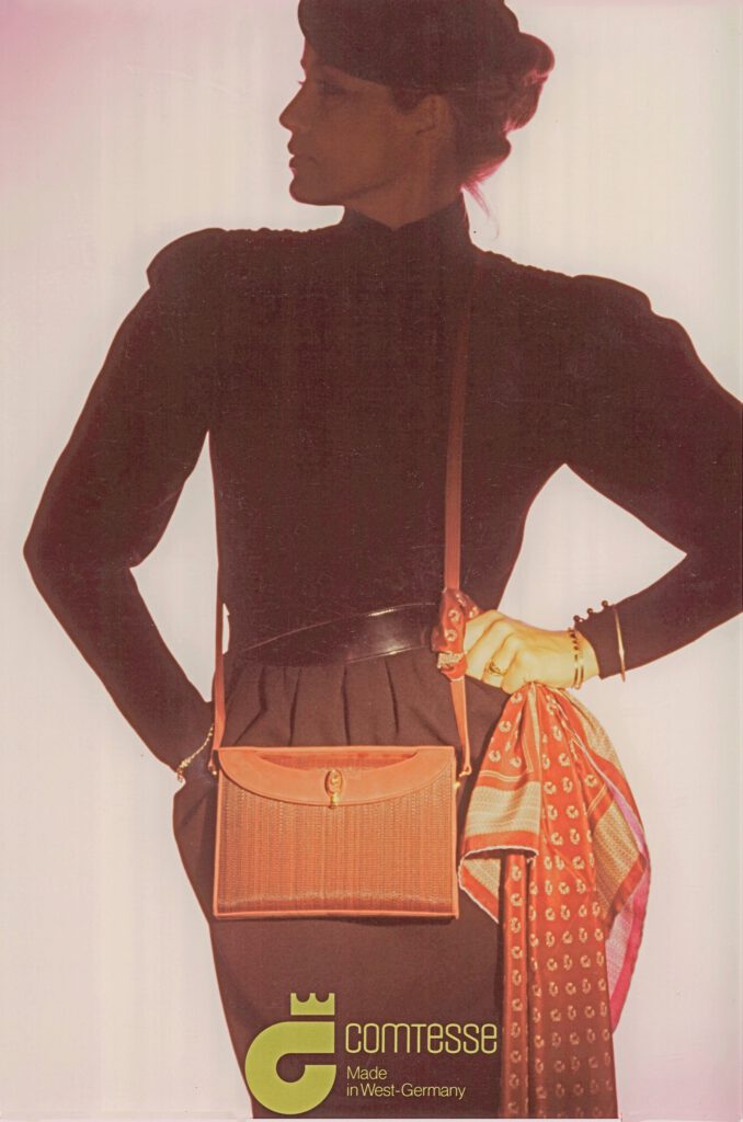 Historische Werbetafel mit Rosshaartasche – „COMTESSE – Made in West-Germany“